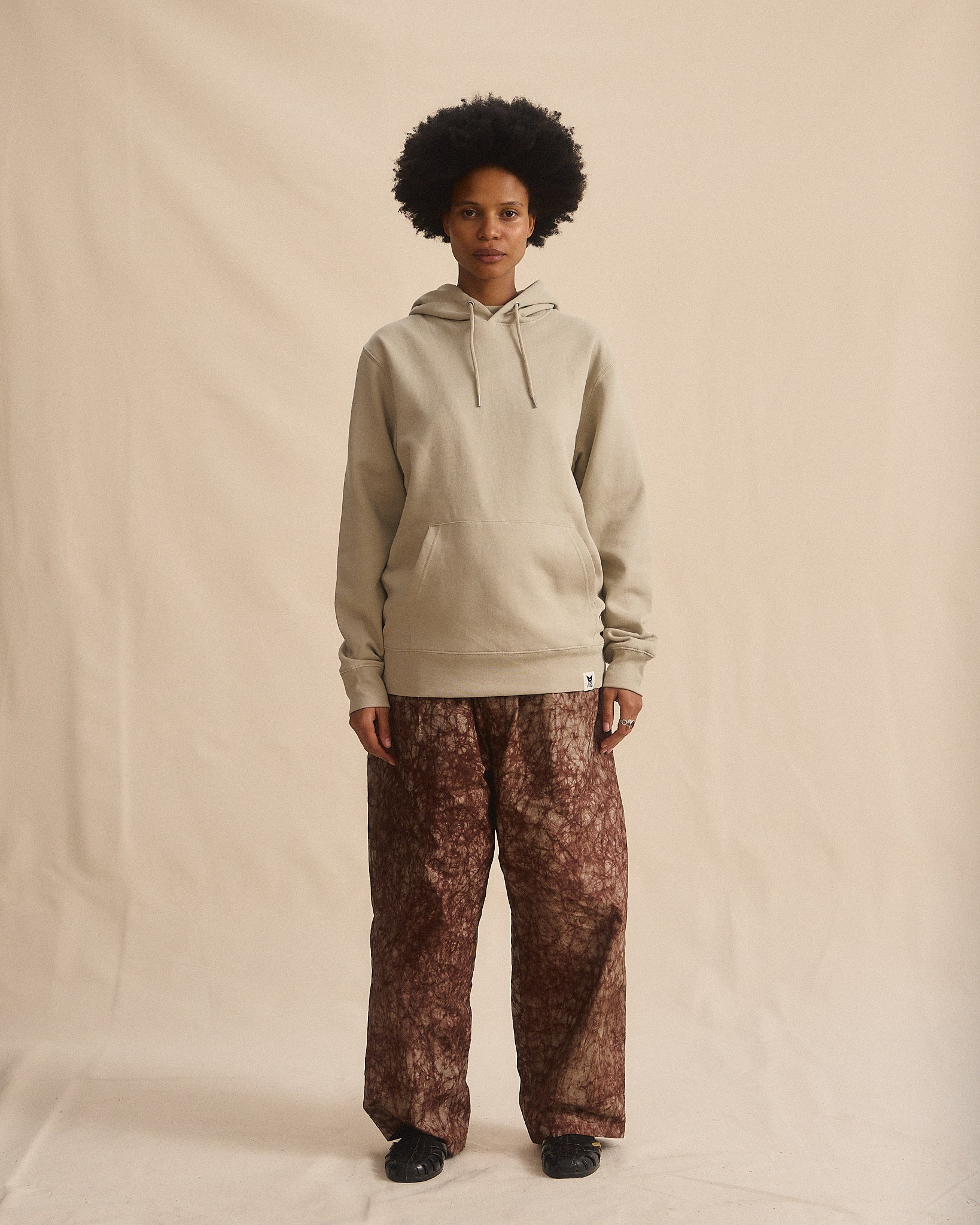 Crafted from a 350 GSM brushed fleece blend of 80% organic cotton and 20% recycled cotton, our hoodie combines classic appeal with conscious comfort. Designed with a medium, modern fit, it features a double self-fabric lined hood and a front kangaroo pocket. The embroidered batik back patch adds our signature artisanal detail, while the brushed interior delivers a soft, cosy feel.