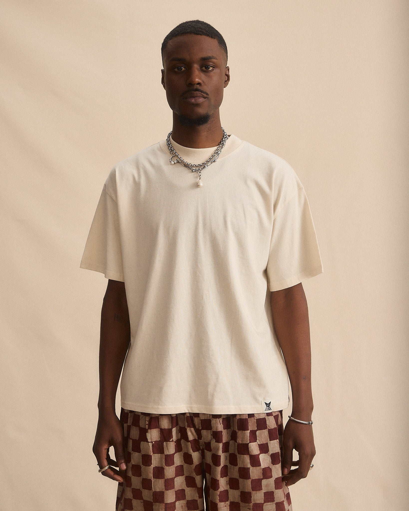 Crafted from 200 GSM 100% organic cotton, our T-shirt offers a slightly cropped, boxy fit with a structured yet relaxed drape. Designed with a ribbed high neck collar for a modern edge and finished with an appliquéd batik back patch, adding our signature artisanal touch to the clean silhouette.